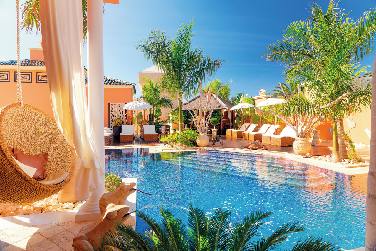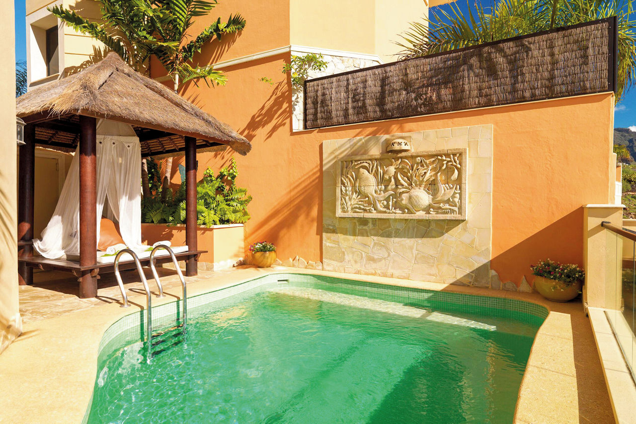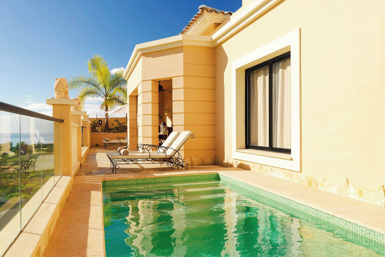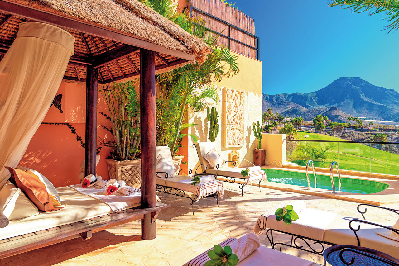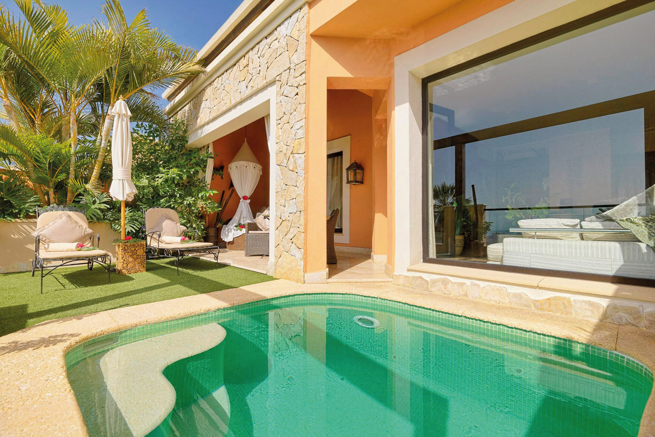 Nestled amid the Costa Adeje?s prestigious golf course, Royal Garden Villas redefine luxury with their exquisite design, private plunge pools and stunning sea views. Beyond your villa, you can revel in flavours curated to perfection in the ? la carte Jardin Restaurant. The fairways of the scenic golf course present an irresistible invitation to a round of the sport, so prepare to play among breathtaking beauty. These boltholes offer a remarkable retreat for those seeking an elevated stay. Who?s up for a relaxing treatment in the spa or a game of squash? If you're a keen golfer, don't forget to visit the nearby championship Costa Adeje golf course.Duchess villas have one bedroom and sleep up to 2 adults and have a bathroom with hydro massage shower, hairdryer, air conditioning, satellite plasma TV, DVD player, separate dining area, fully equipped kitchen with fridge, oven, utility room, lounge area, furnished balcony and private pool. Grand Duchess villas with one bedroom, Princess villas with two bedrooms sleeping up to 4, Majestic villas with two bedrooms and Royal villas with three bedrooms sleeping up to 6 are also available.