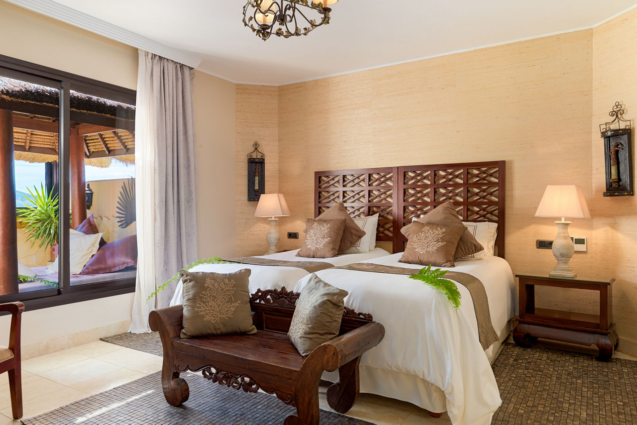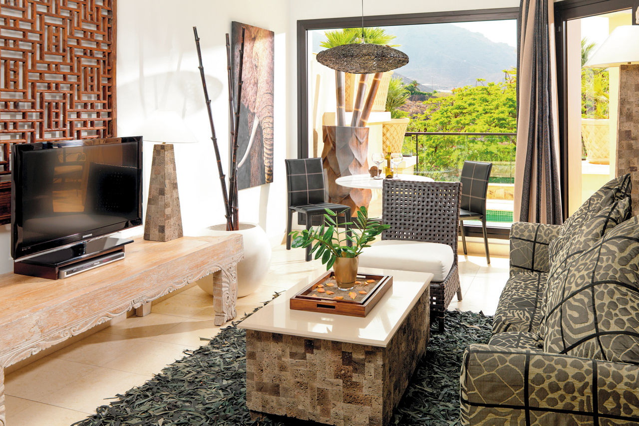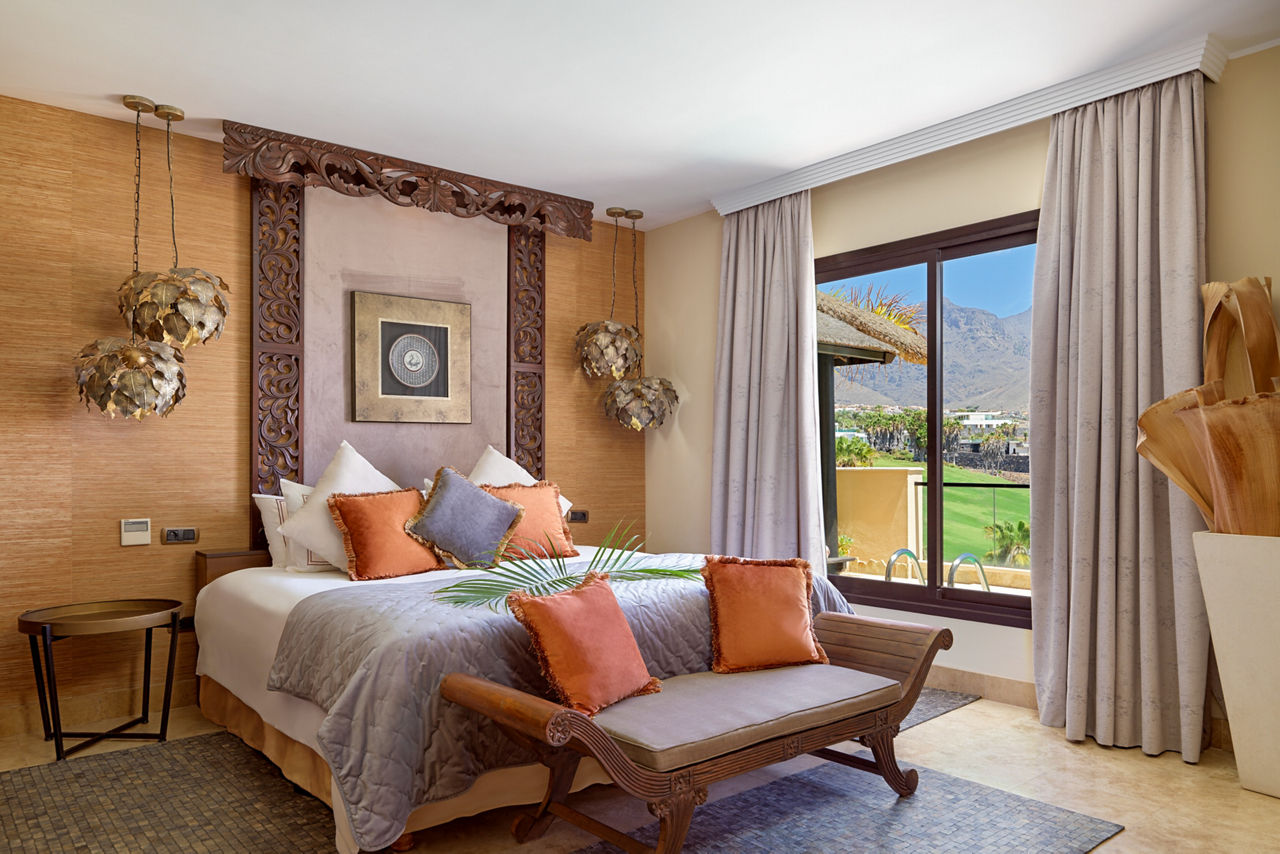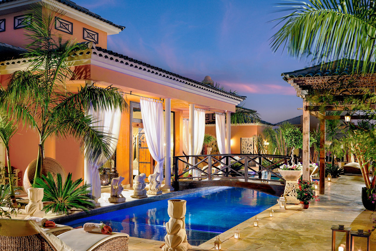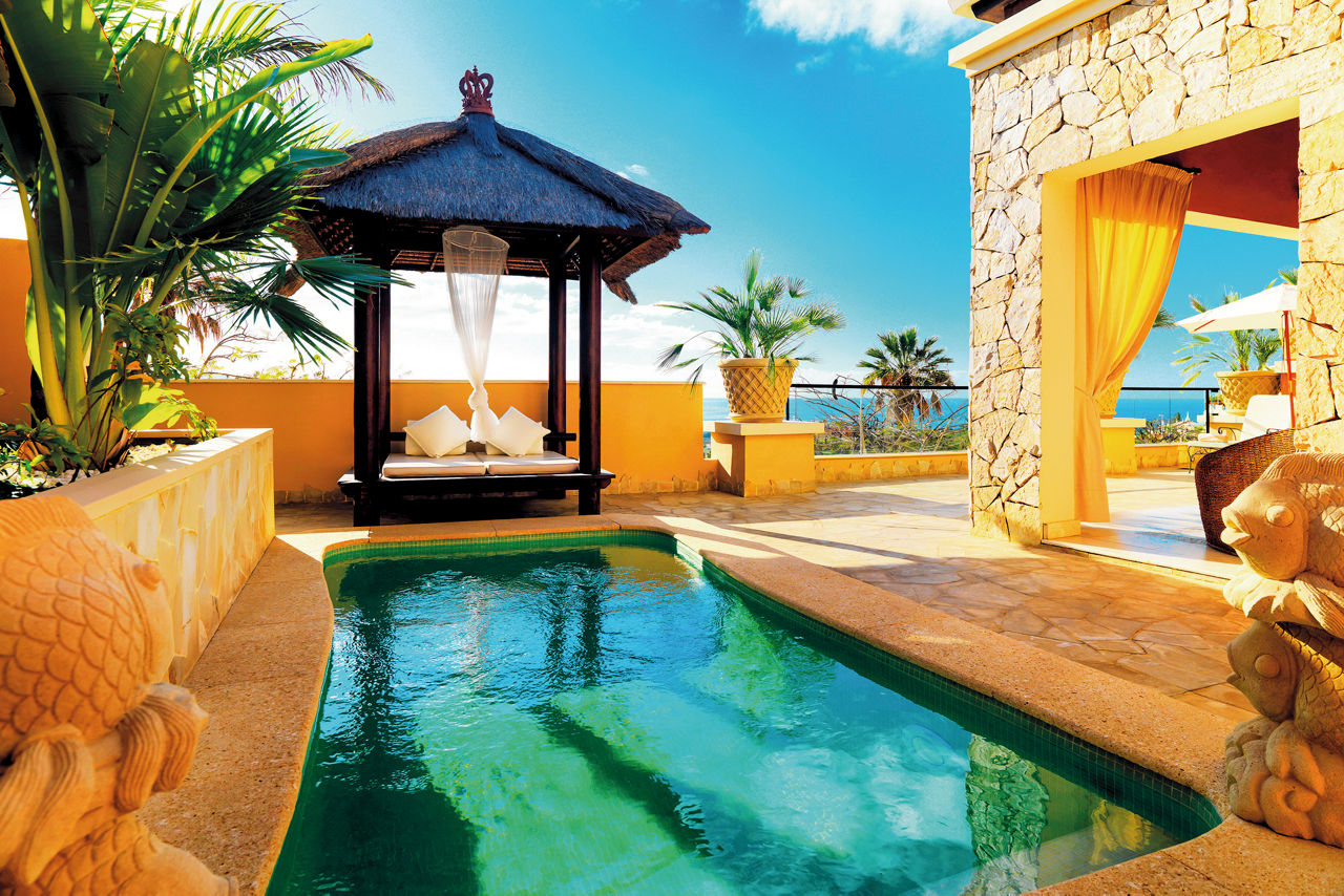 Nestled amid the Costa Adeje?s prestigious golf course, Royal Garden Villas redefine luxury with their exquisite design, private plunge pools and stunning sea views. Beyond your villa, you can revel in flavours curated to perfection in the ? la carte Jardin Restaurant. The fairways of the scenic golf course present an irresistible invitation to a round of the sport, so prepare to play among breathtaking beauty. These boltholes offer a remarkable retreat for those seeking an elevated stay. Who?s up for a relaxing treatment in the spa or a game of squash? If you're a keen golfer, don't forget to visit the nearby championship Costa Adeje golf course.Duchess villas have one bedroom and sleep up to 2 adults and have a bathroom with hydro massage shower, hairdryer, air conditioning, satellite plasma TV, DVD player, separate dining area, fully equipped kitchen with fridge, oven, utility room, lounge area, furnished balcony and private pool. Grand Duchess villas with one bedroom, Princess villas with two bedrooms sleeping up to 4, Majestic villas with two bedrooms and Royal villas with three bedrooms sleeping up to 6 are also available.