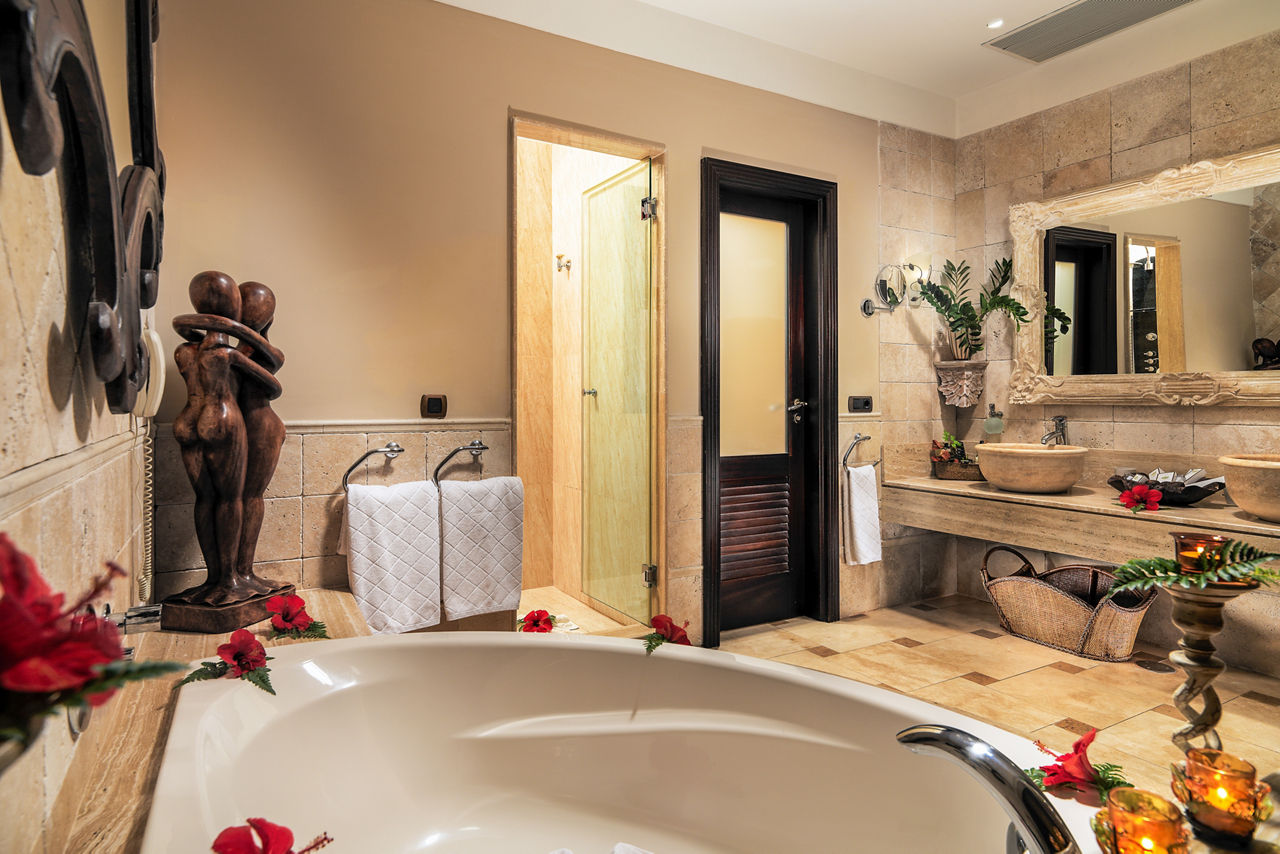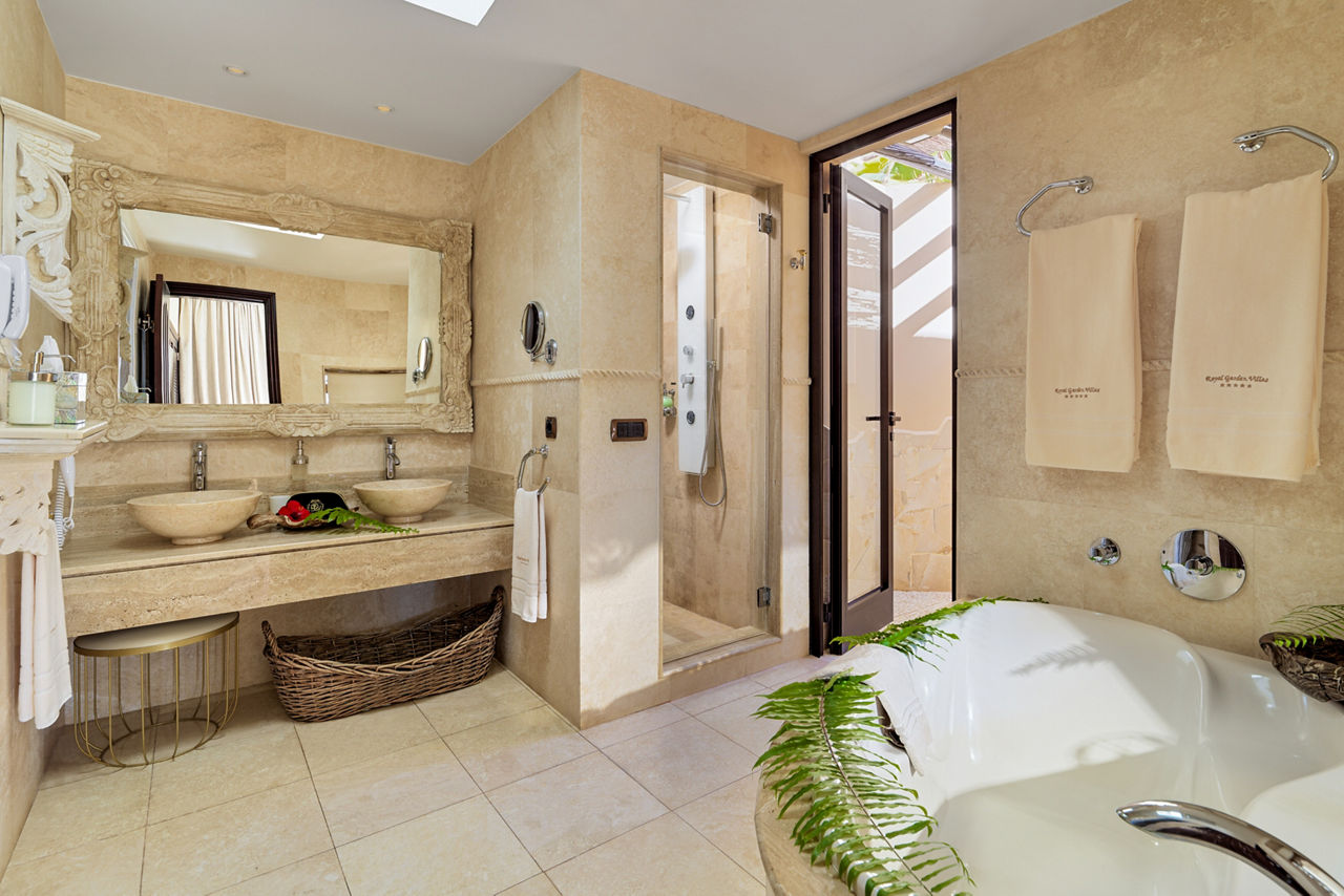 Duchess villas have one bedroom and sleep up to 2 adults and have a bathroom with hydro massage shower, hairdryer, air conditioning, satellite plasma TV, DVD player, separate dining area, fully equipped kitchen with fridge, oven, utility room, lounge area, furnished balcony and private pool. Grand Duchess villas with one bedroom, Princess villas with two bedrooms sleeping up to 4, Majestic villas with two bedrooms and Royal villas with three bedrooms sleeping up to 6 are also available.